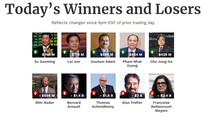Theo thống kê của Forbes, trong phiên giao dịch ngày 23/6, khối tài sản của Chủ tịch tập đoàn Vingroup ghi nhận mức tăng 484 triệu USD, tương đương hơn 11.100 tỷ đồng. Tỷ phú Phạm Nhật Vượng đứng thứ 4 trong danh sách những tỷ phú USD ghi nhận tăng tài sản mạnh nhất trong ngày 23/6 của Forbes theo thời gian thực.